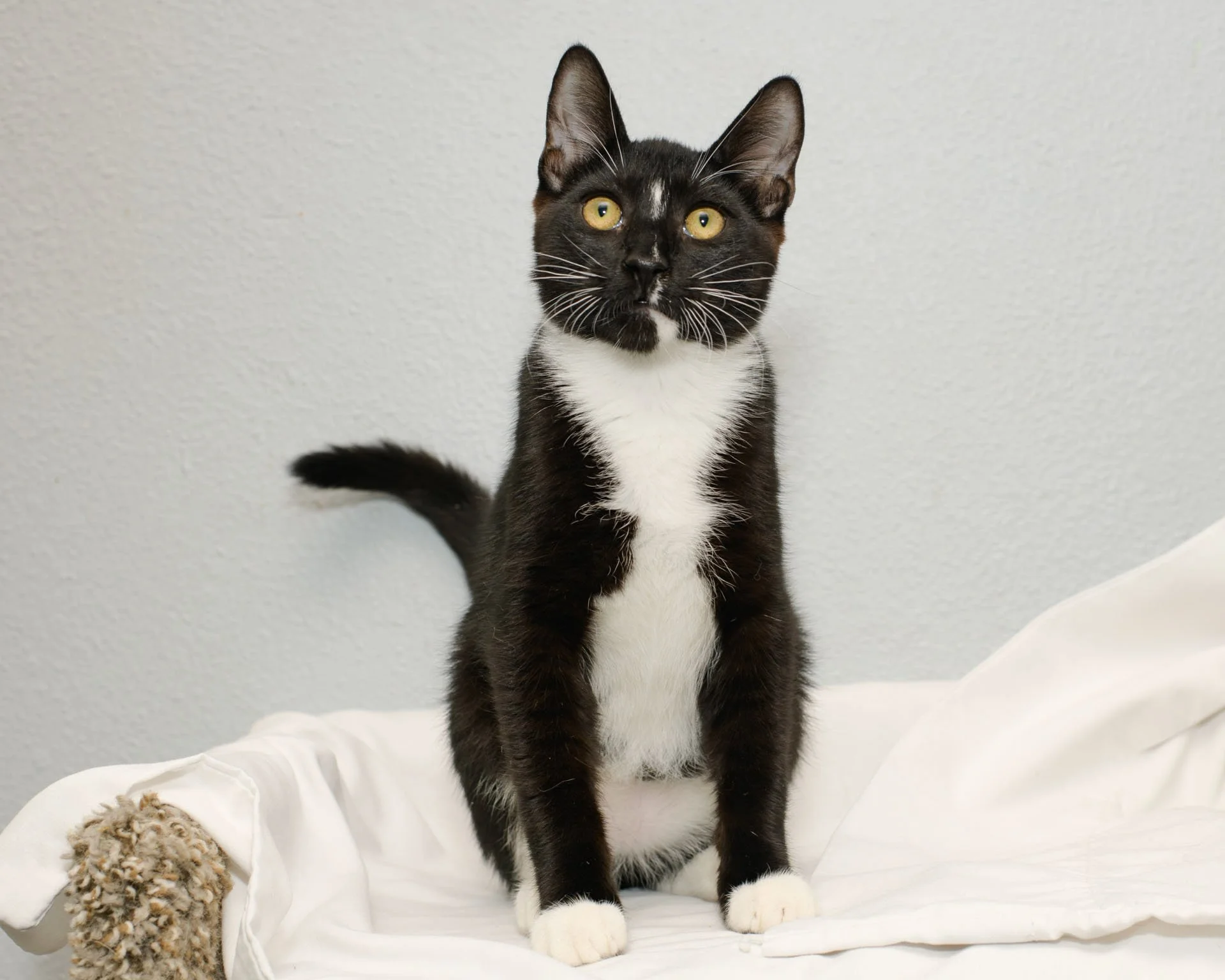 My story: Meet Oreo! This sweet little guy, along with his two brothers, were born here in our very shelter! Their momma, Mouse, took such wonderful care and with all that time being handled by shelter staff, they’ve become extremely social kittens. Oreo is the lover of the three. He purrs constantly, and is always in search of the best lap for cuddles. His bright eyes will just melt your heart when you meet him. Come see for yourself and maybe give this boy a fur-ever home!