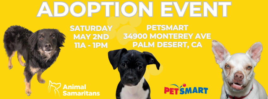 Join Animal Samaritans on Saturday, May 2nd from 11am to 1pm at PetSmart in Palm Desert for our monthly Pet Adoption Event.