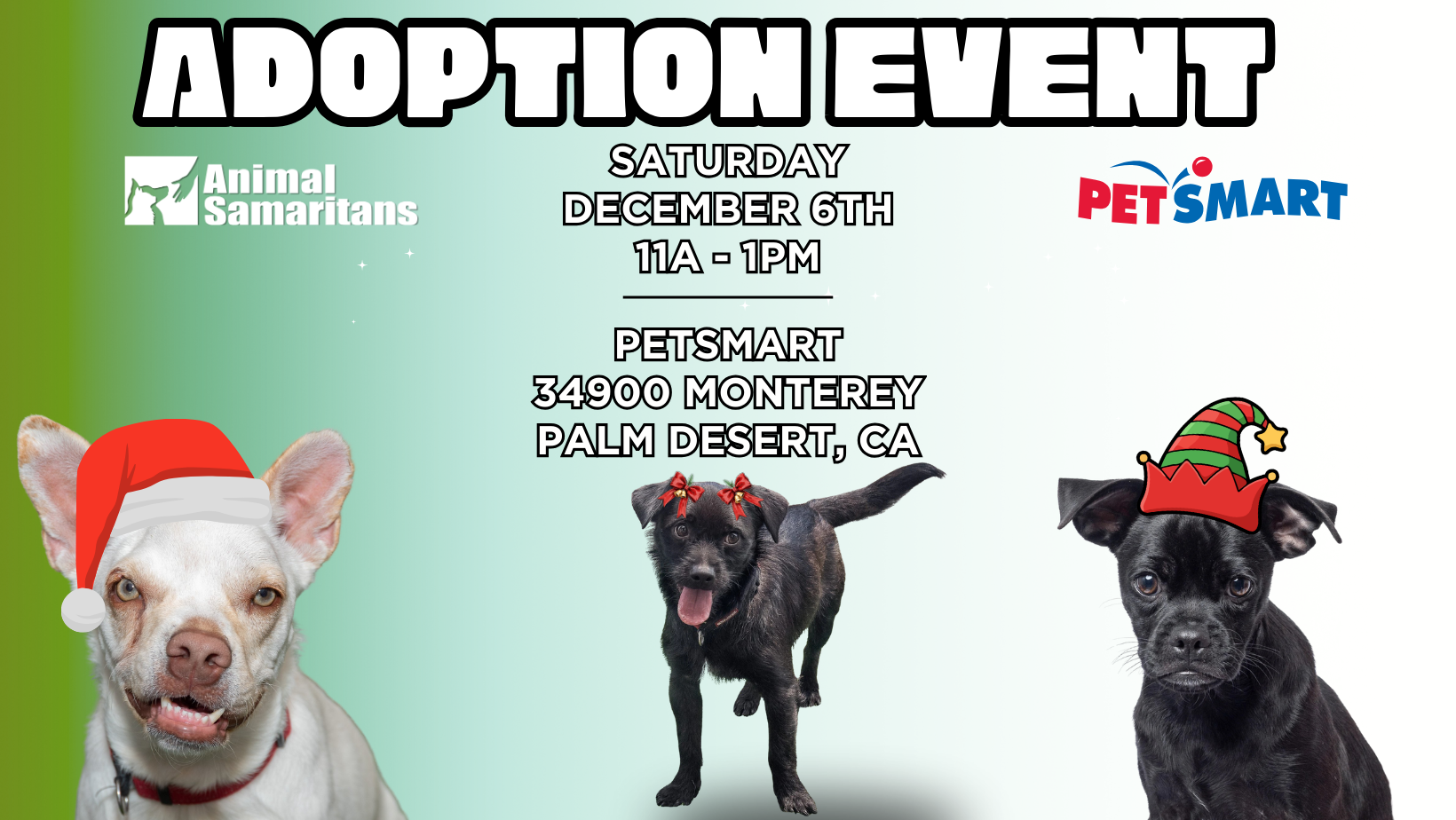 Join Animal Samaritans on Saturday, December 6th from 11am to 1pm at PetSmart in Palm Desert for our festive Pet Adoption Event.