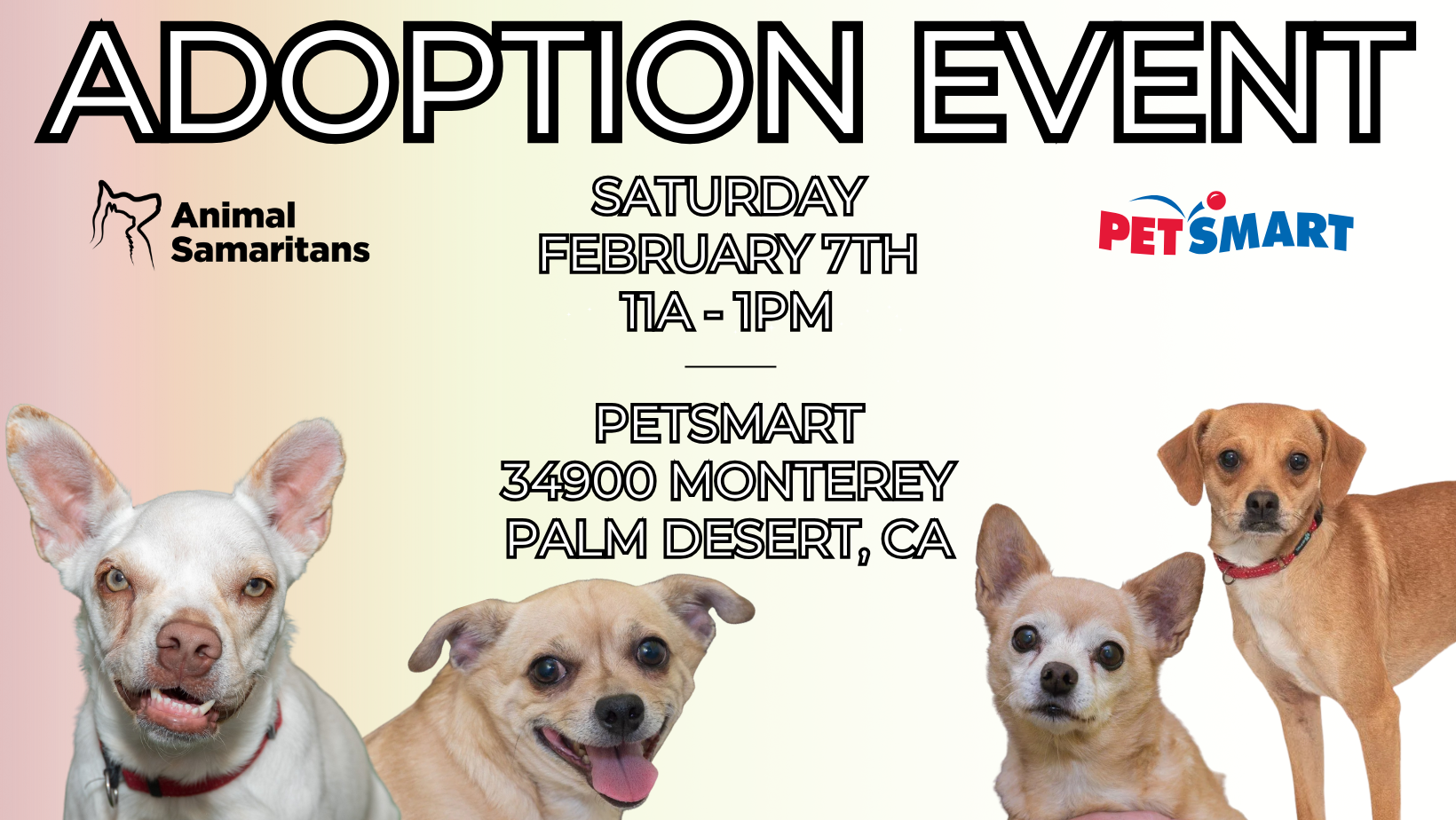 Join Animal Samaritans on Saturday, February 7th from 11am to 1pm at PetSmart in Palm Desert for a heartwarming Pet Adoption Event.