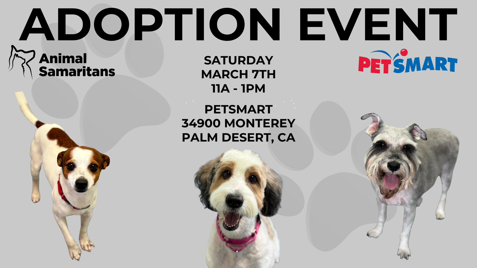 Join Animal Samaritans on Saturday, March 7th from 11am to 1pm at PetSmart in Palm Desert for our monthly Pet Adoption Event.